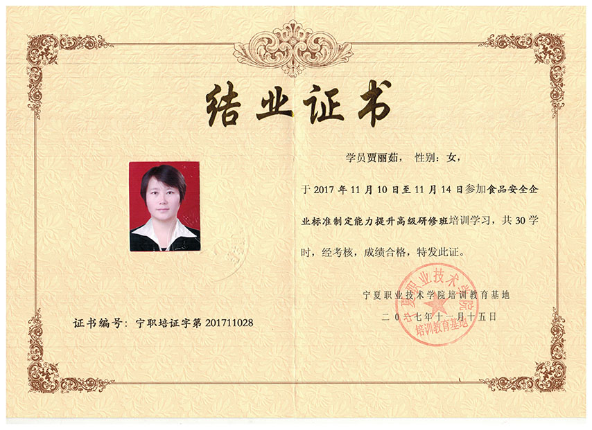 賈麗茹同志食品安全企業(yè)標準制定能力提升高級研修班結(jié)業(yè)證書