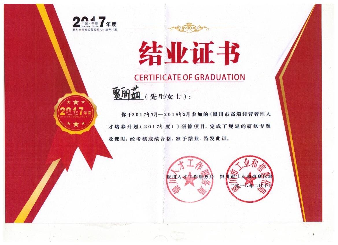 賈麗茹銀川市高端經(jīng)營(yíng)管理人才培養(yǎng)計(jì)劃(2017年度)結(jié)業(yè)