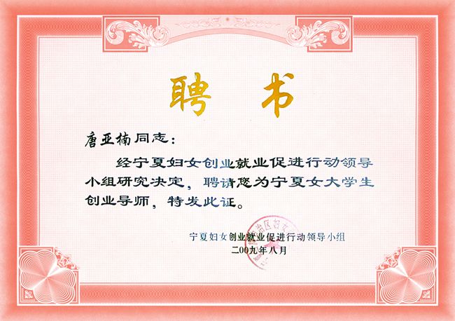 唐亞楠被評為寧夏女大學(xué)生創(chuàng)業(yè)導(dǎo)師