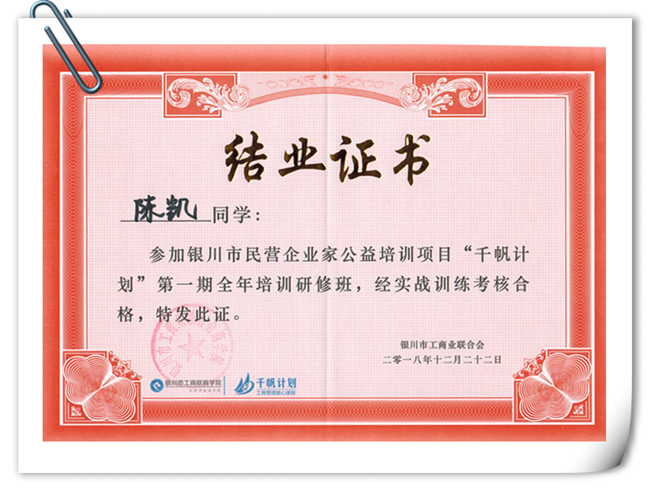 伊百盛陳凱榮獲“千帆計(jì)劃”培訓(xùn)合格結(jié)業(yè)證書