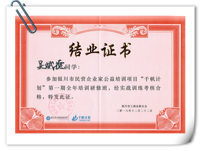 伊百盛吳斌德“千帆計(jì)劃”培訓(xùn)合格結(jié)業(yè)證書