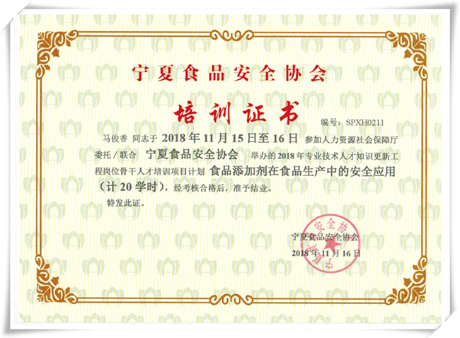 寧夏食品安全協(xié)會培訓結業(yè)證書
