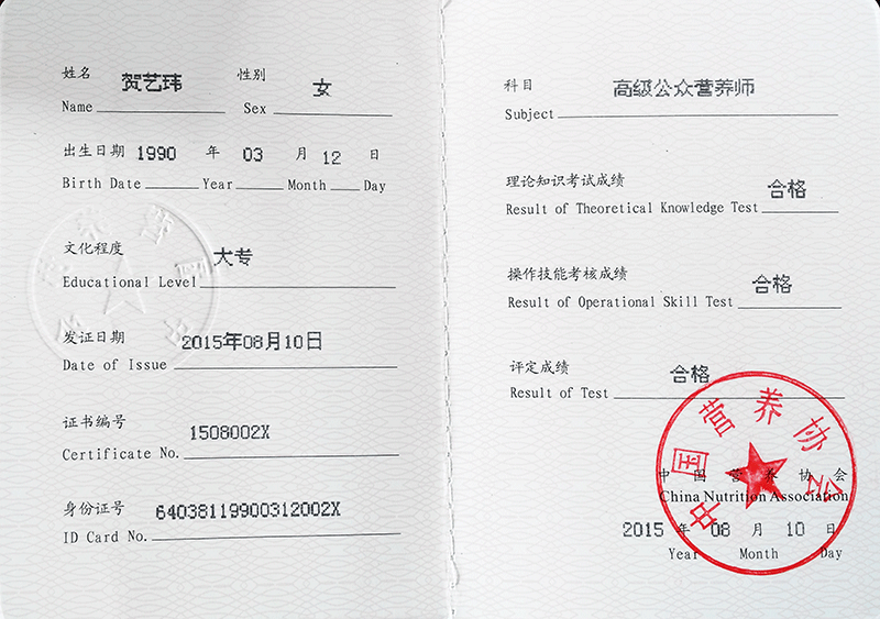 賀藝瑋獲得高級公眾營養(yǎng)師資格