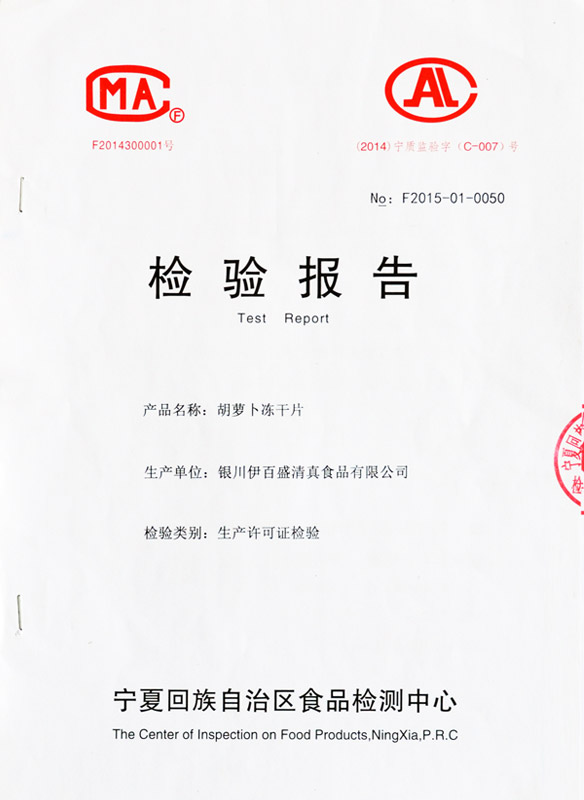 胡蘿卜凍干片檢驗報告