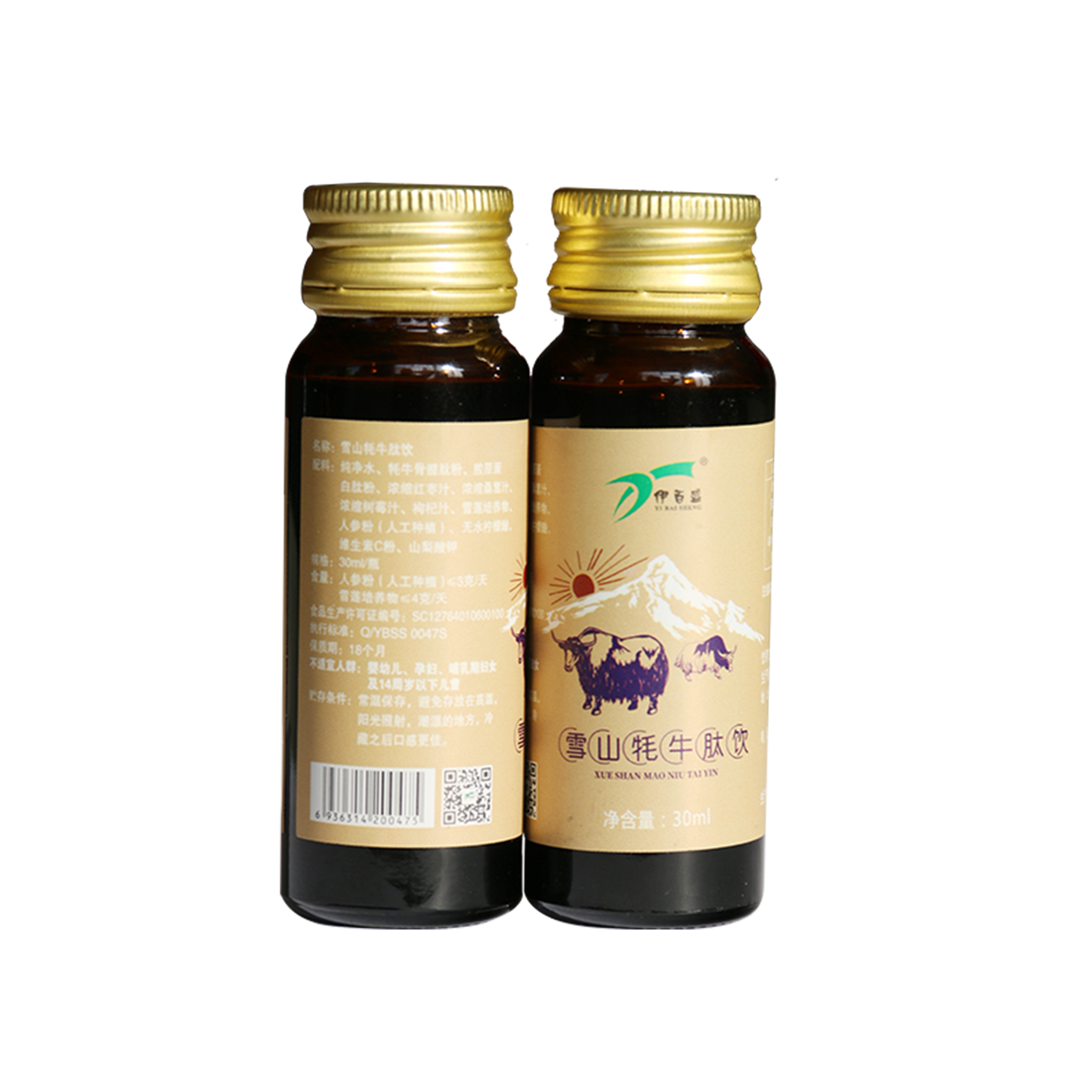 配料:純凈水、牦牛骨髓肽粉、膠原蛋白肽粉、濃縮紅棗汁、濃縮桑葚汁、濃縮樹莓汁、枸杞汁、雪蓮(培養(yǎng)物)果粉、人參(人工種植)粉、無水檸檬酸、維生素C粉、山梨酸鉀