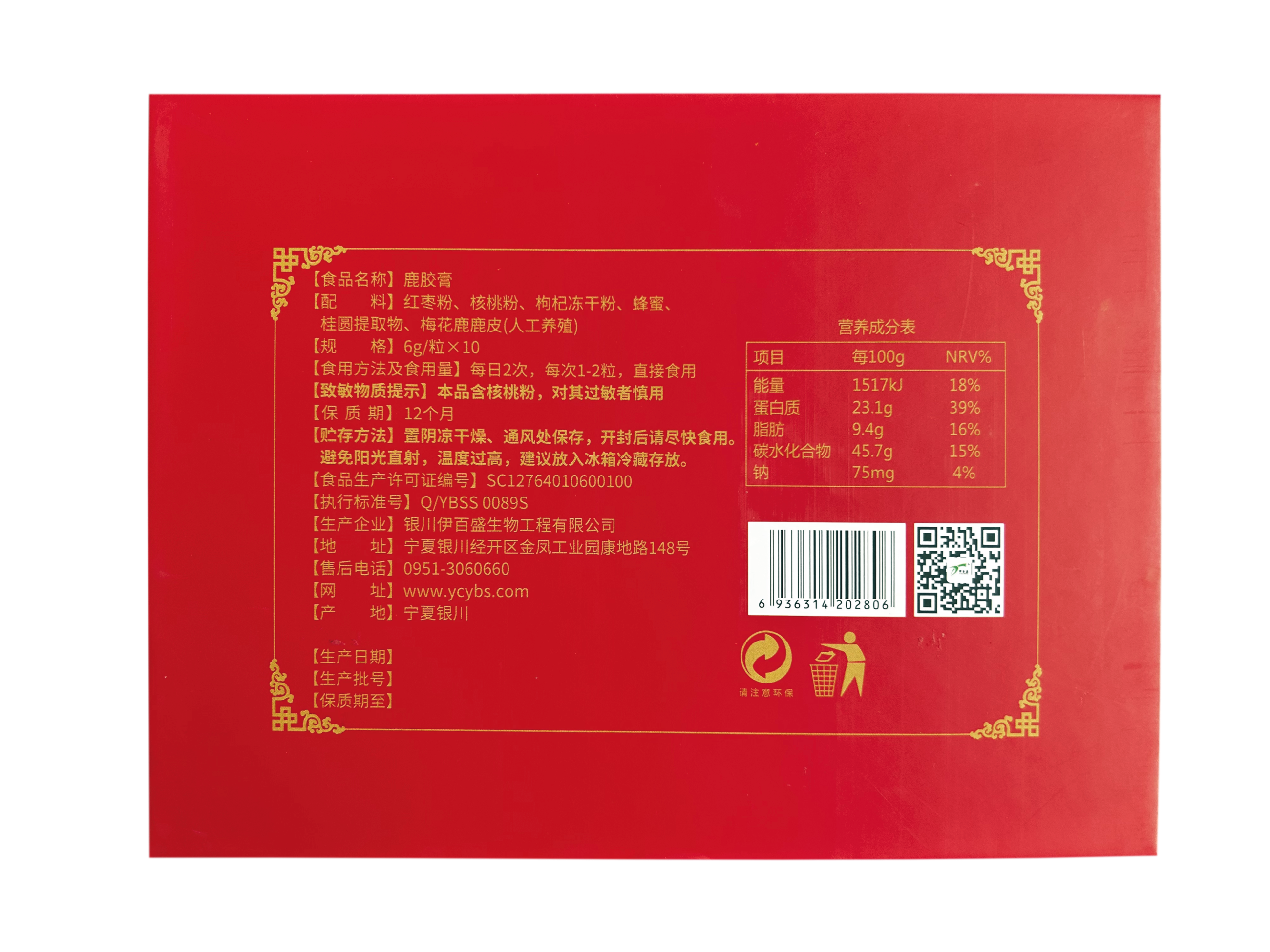 【食品名稱】鹿膠膏【配料】紅棗粉、核桃粉、枸杞凍干粉、蜂蜜、配桂圓提取物、梅花鹿鹿皮(人工養(yǎng)殖)格】6g/粒x10規(guī)【食用方法及食用量】每日2次,每次1-2粒,直接食用【致敏物質(zhì)提示】本品含核桃粉,對其過敏者慎用【保 質(zhì) 期】12個月【貯存方法】置陰涼干燥、通風(fēng)處保存,開封后請盡快食用。避免陽光直射,溫度過高,建議放入冰箱冷藏存放【食品生產(chǎn)許可證編號】SC12764010600100【執(zhí)行標(biāo)準(zhǔn)號】