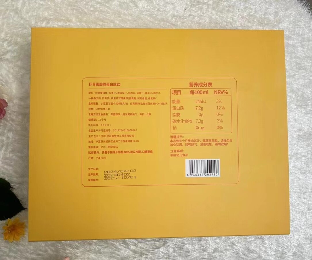 配料:膠原蛋白肽、紅棗汁、濃縮梨計(jì)、純凈水、藍(lán)莓汁、桑葚汁、枸杞汁、γ-氨基丁酸、蝦青素(雨生紅球藻來源)微囊粉、阿拉伯膠、維生素C